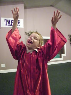 It was such a sweet ceremony! The kids marched in, then shared what they wanted to be when they grew up. Nathan said he wanted to be a solider, but in class, he had told his teacher that he wanted to make movies, and that everyone should call him "Director Howell"! Then they sang some of their preschool songs. Finally, each of them got a "diploma", and the parents got a folder with selected papers from our child's preschool years. It was a very special evening.Nathan singing during the ceremony. I thought it was neat that he was next to 2 of his best friends from church, Mady and Hailey!